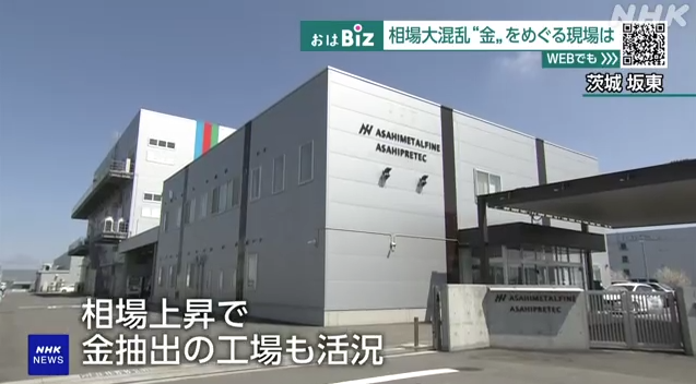 番組では金価格高騰による影響が取り上げられ、金のリサイクル工場としてアサヒメタルファインの坂東工場の生産の様子が紹介されました。また、電子部品からの回収量の増加見通しについて、アサヒプリテック従業員のインタビューが紹介されています。