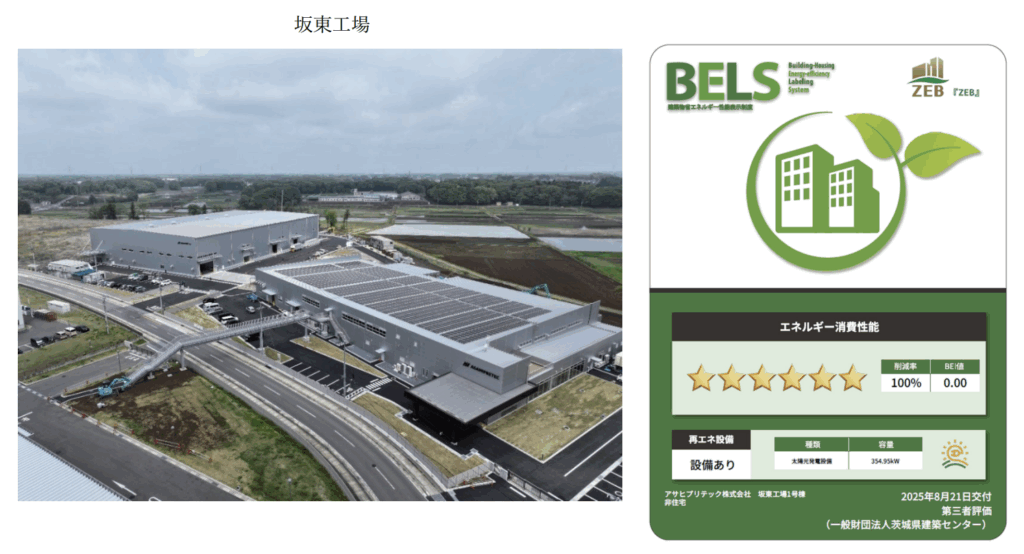 アサヒプリテック株式会社(本社:東京都千代⽥区 代表取締役社⻑:岩佐 義仁、以下、「当社」)は、この度、坂東⼯場(所在地: 茨城県坂東市緑の⾥ 17-1、延床⾯積: 約 14,000 ㎡)において国⼟交通省認定の建築物省エネルギー性能表⽰制度における最⾼評価の 6 スター(2024 年 4 ⽉より新基準)と ZEB の認証を取得いたしました。